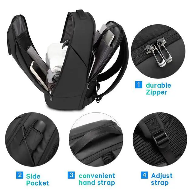 The laptop backpack is USB version revision be a more minimalist design , so the backpack no USB charge port and reduce some function ,such no two side pocket and the shoulder strap no ID card pocket,glasses hang bucks, so choose suitable yourself ones, the commute backpack can hold 15.6 inch laptop,The front pocket can be use fit casual shoes,sky ,9.7 ipad,Magazine and Other ,the main pocket can contain 4-5 clothing,and the the laptop pocket compartment can hold 15.6 inch laptop.the side have a pocket can store kettle,umbrella.laptop backpack adopt in durable zipper,have luggage strap for your trip be convenient,the travel backpack have a anti theft pocket on back,you don’t worry miss of your producs.