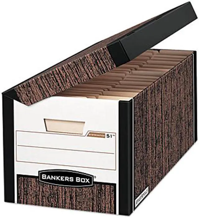 Medium-duty box offers an attached flip-top lid so you'll never lose it. Ideal for higher stacking or for use with shelving. FastFold One Step Setup makes box assembly fast and easy. Reinforced, tear-resistant hand holes make box comfortable to carry. Use storage box to store your letter-size or legal-size files. Average amount of evenly distributed weight that can be safely stacked on top of box is 650 lb. Storage box is made with a high percentage of recycled material.