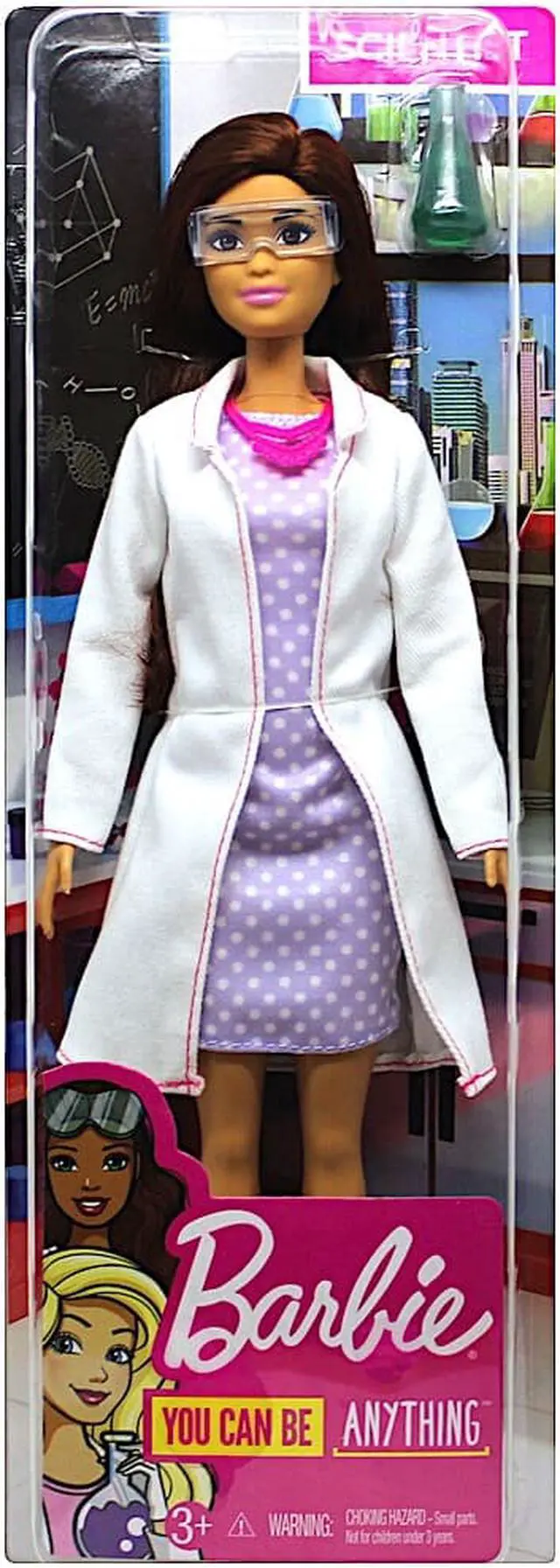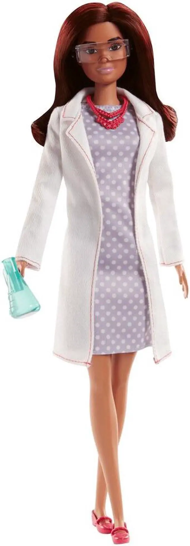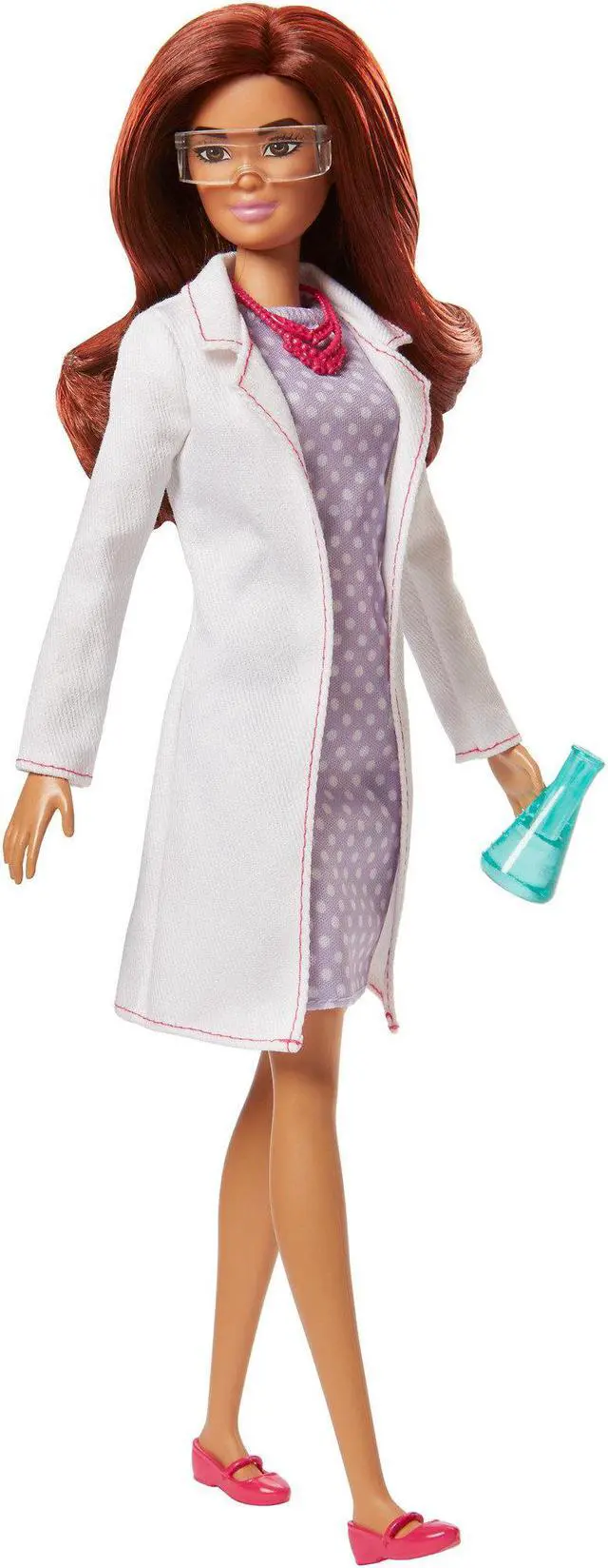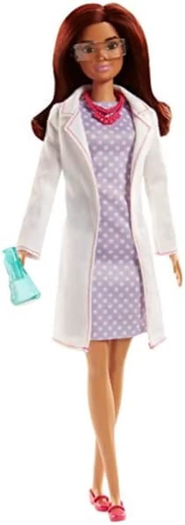Dream big with Barbie career dolls -- each doll wears a professionally themed outfit and comes with an accessory to expand play! Barbie scientist doll can look for her next big discovery in a trendy dress with white lab coat, pink shoes and pink necklace. A pair of goggles and a blue beaker spark imaginations and create endless storytelling possibilities! Explore so many opportunities and collect all of the Barbie career dolls because you can be anything with Barbie (each sold separately). Includes Barbie scientist doll wearing fashions and accessories, plus goggles and beaker. Doll cannot stand alone.