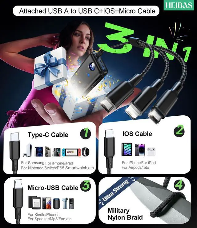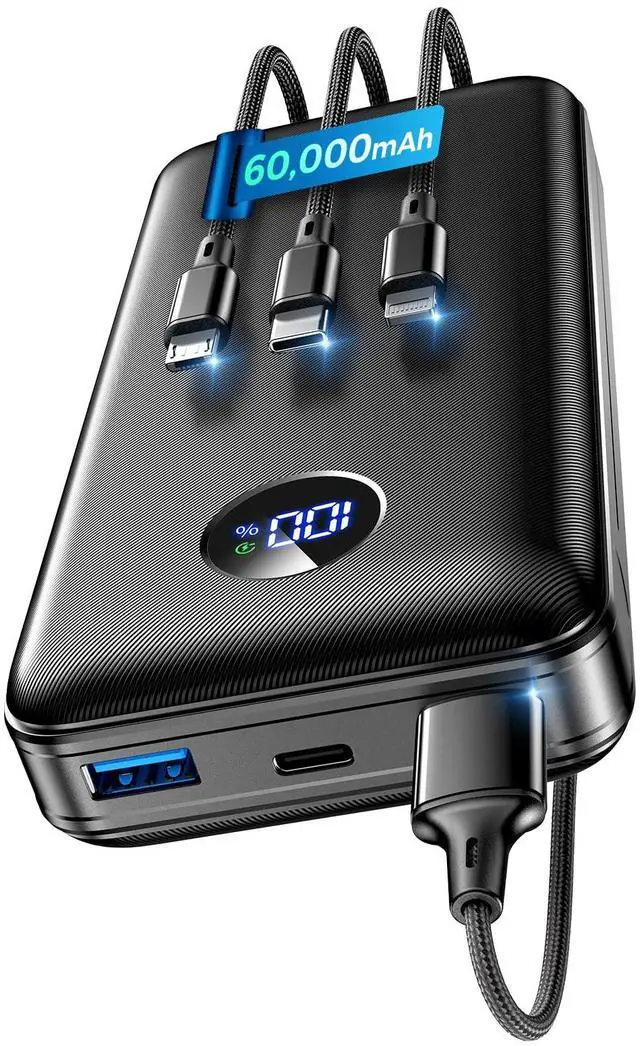 Portable Charger Power Bank - 60,000mAh Battery Pack, 22.5W Fast Charging Phone Charger Attached USB-C/iOS/Micro-USB Cable, Powerbank for iPhone 17 16 15 14 13 Samsung, for Travel Camping Essentials