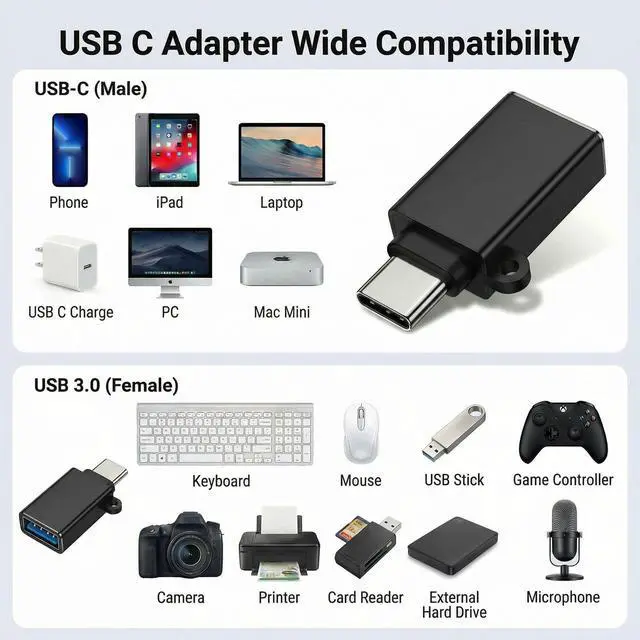 - Use this USB Adapter to USB C,Data transfer speed is at the standard of USB 3.0 5Gb/s, supports OTG Tech, and Sync movies, music, and more in seconds,10X faster more than USB 2.0.