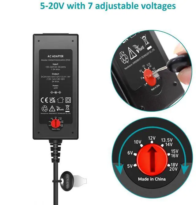 65W 5-20V Universal Power Adapter with 16 DC Tips