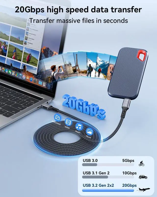 20Gbps High-Speed Data Transfer: Experience blazing-fast sync and file transfers with this USB C data transfer cable. Supporting USB 3.2 Gen 2 speeds up to 20Gbps, its perfect for transferring large videos or backing up SSDs and hard drives in secondsdoubling the speed of standard USB 3.0 cables. Ideal for creators and professionals who value efficiency.