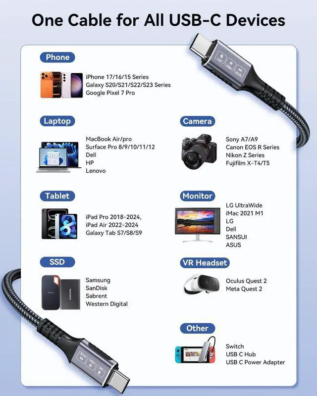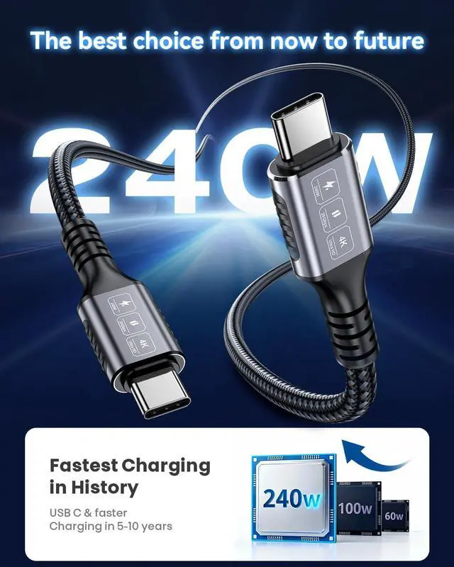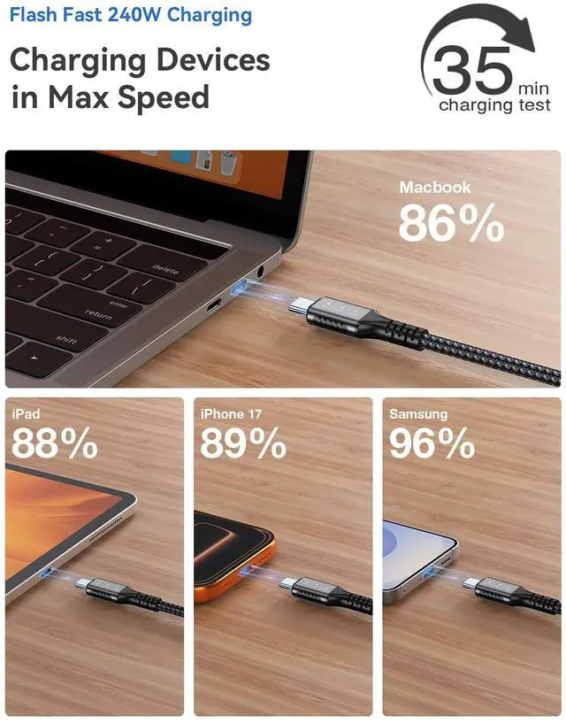 240W PD Fast Charging for Power-Hungry Devices: Power up your devices at top speed with this 240W USB C cable. Featuring PD 3.1 fast charging support, it delivers maximum power to compatible laptops, tablets, and phones. Whether you're charging a MacBook Pro or Galaxy phone, enjoy rapid, safe power delivery that cuts down charging time dramatically.