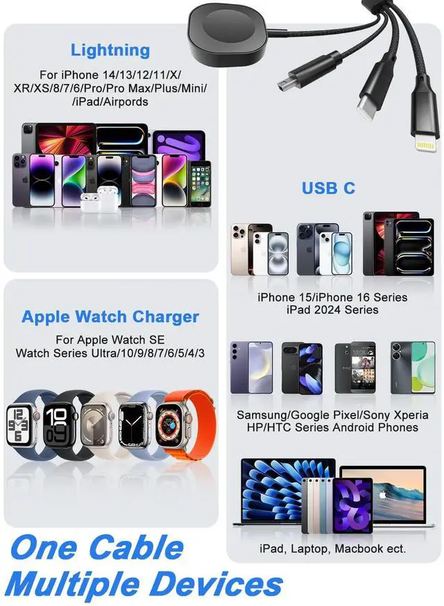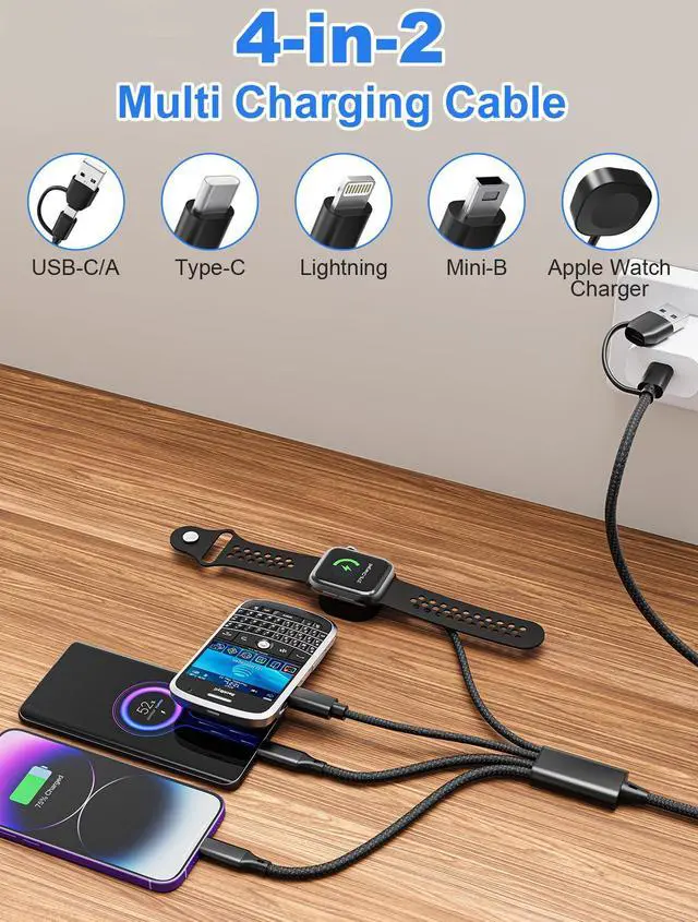 This 100W Multi Charging Cable have unique dual input (USB-A/USB-C) and 4 outputs port: 100W USB-C port, Mini B port, 27W Lightning port, and a magnetic Apple Watch Charger.