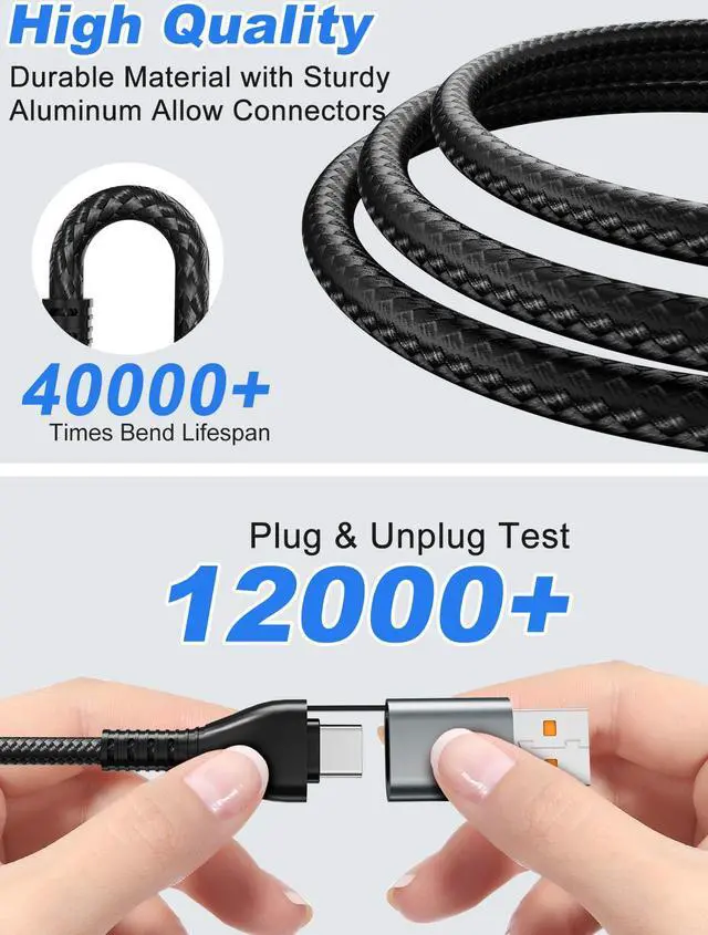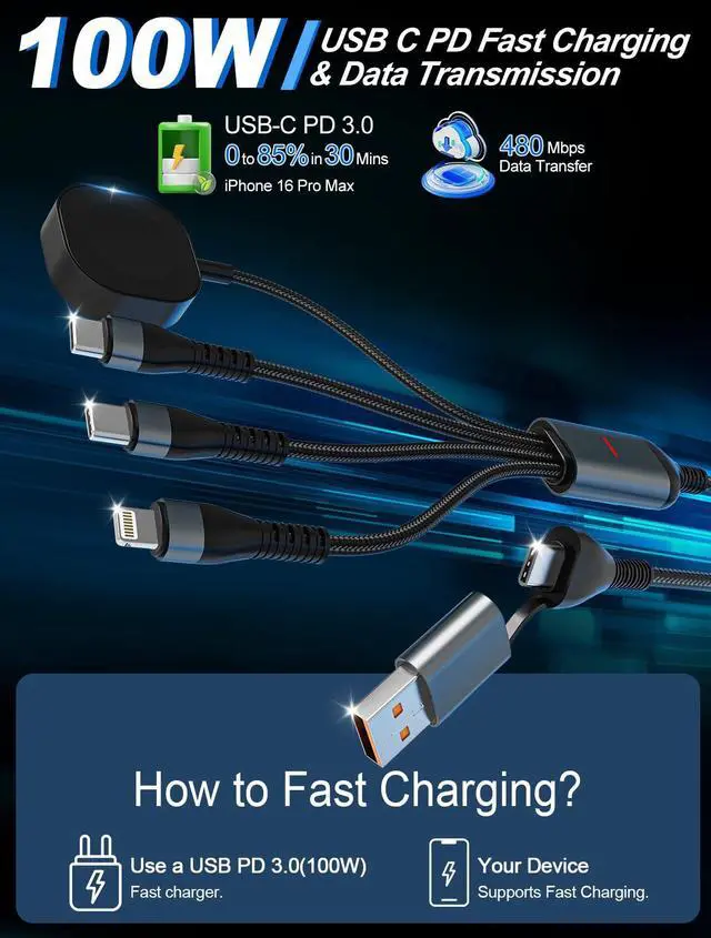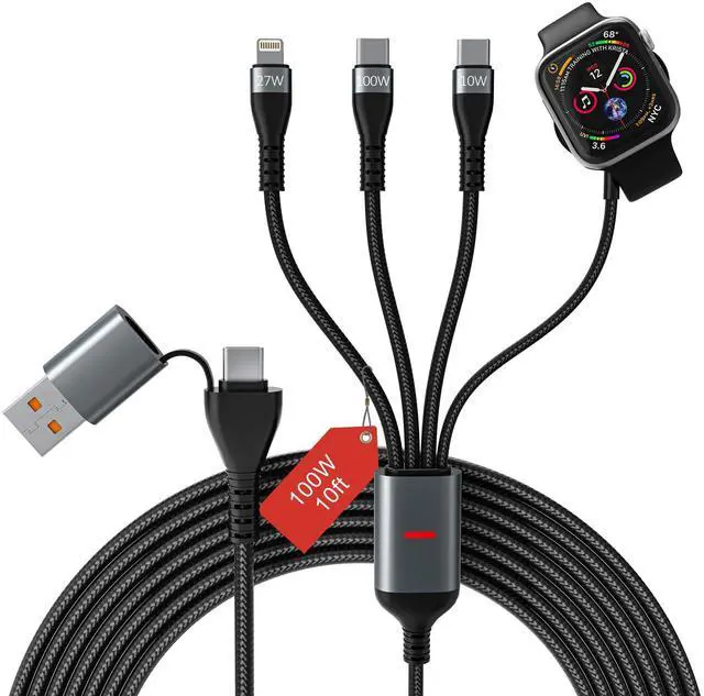4-in-1 Multi Charging Cable with Dual USB-C, One is 100W and the Other is 10W.
