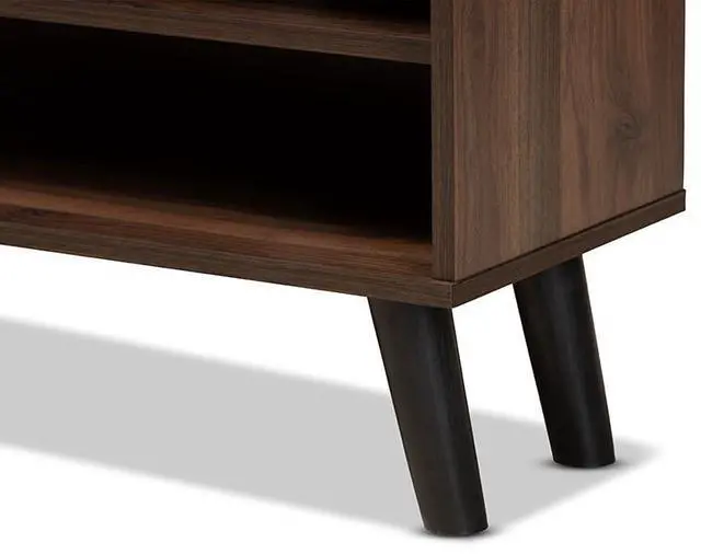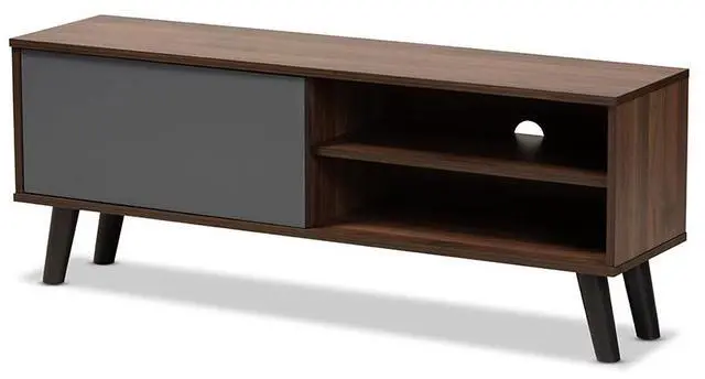 Displaying contemporary design motifs, the Mallory TV stand modernizes any space. Made in Malaysia, the Mallory is comprised of sturdy wood showcasing a two-tone finish of walnut brown and grey for a cool, modern look. Two external shelves and one additional shelf behind the door to provide easy storage for all your living room essentials. Requiring assembly, the Mallory is also equipped with a cord management hole to easily connect your media devices. Angled legs lend a chic mid-century touch. A fantastic blend of modern design and utility, the Mallory TV stand enhances any space.