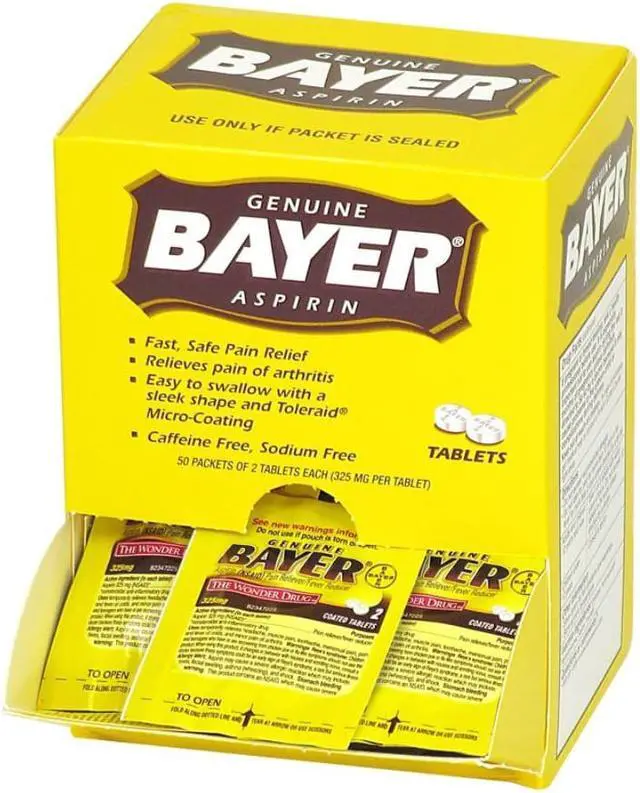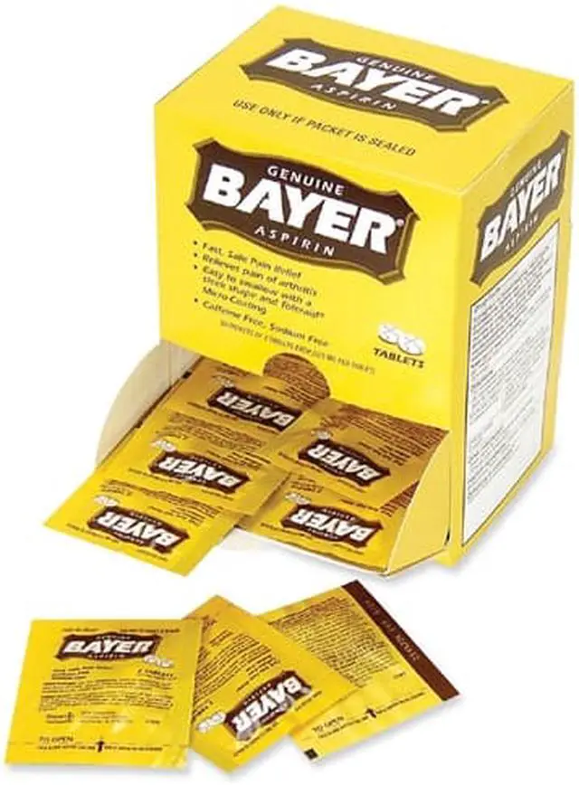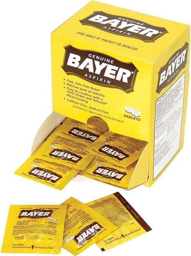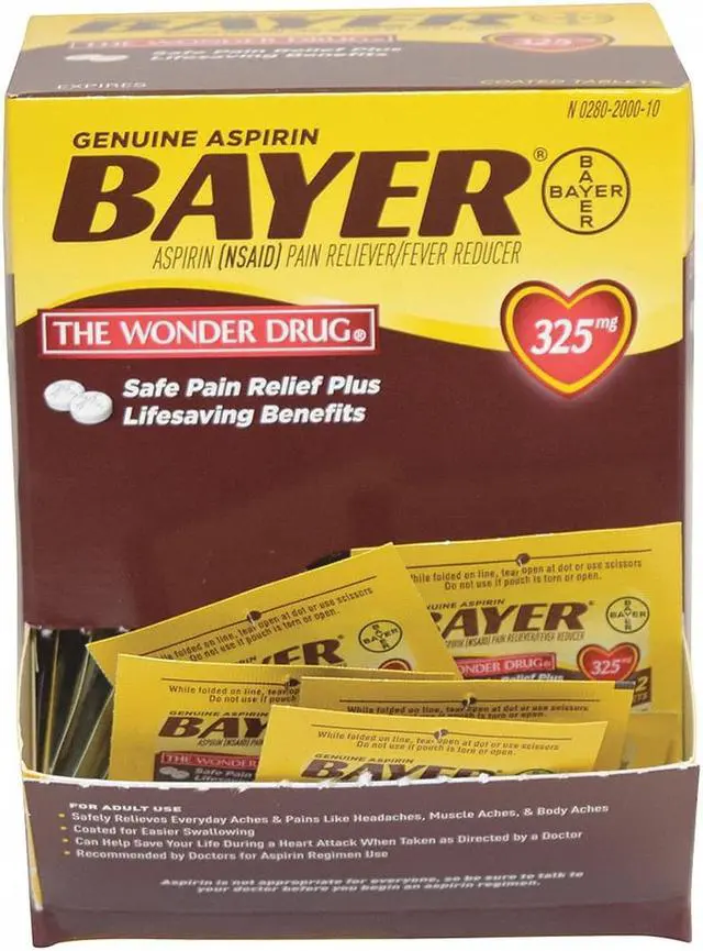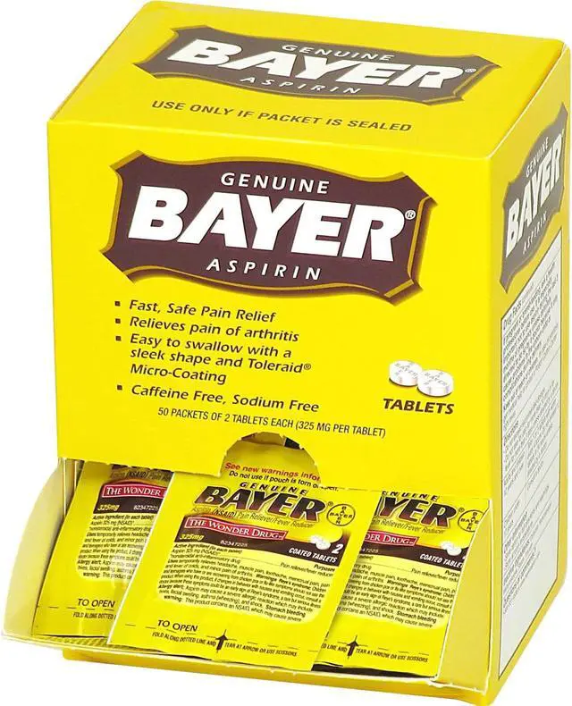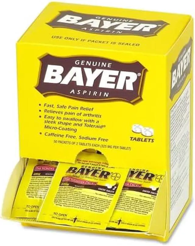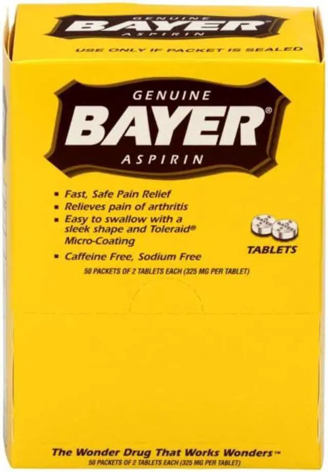 Reduce minor aches and pains with this box of aspirin. This box contains 50 individually sealed two-tablet packets for easy dispensing, and the fold-open panel on the box simplifies access. A dose of 325 milligrams of the active ingredient in each tablet provides fast, reliable relief. These Bayer aspirin tablets are micro-coated for easy swallowing.
