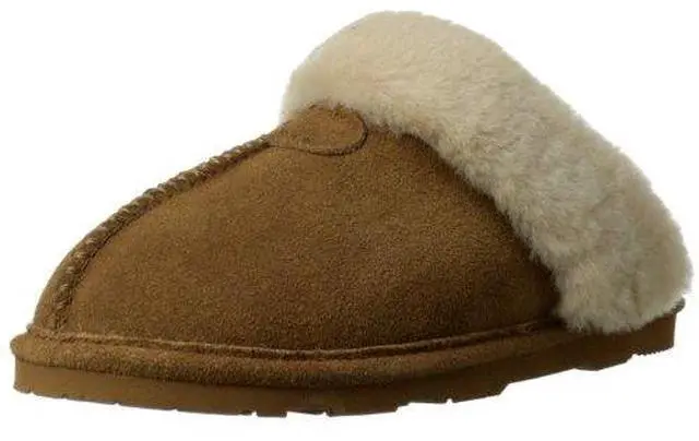 100% Suede. Dyed sheep fur. Rubber sole. Shearling lined. Bearpaw Womens Loki Slide Slipper - Hickory - Size 9.