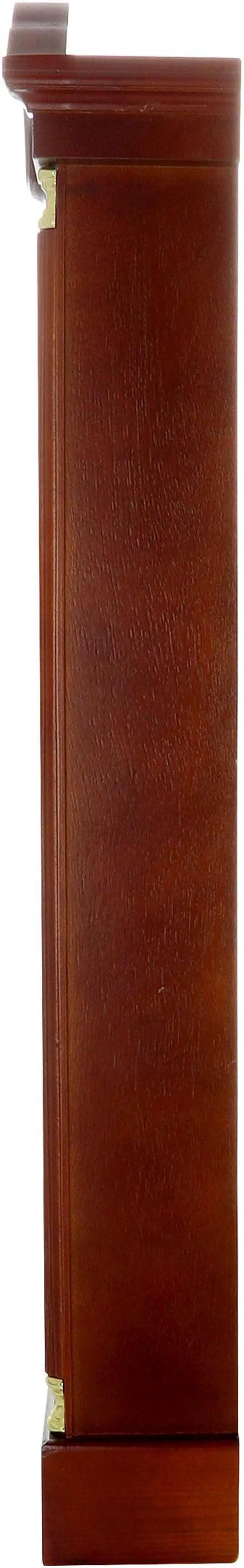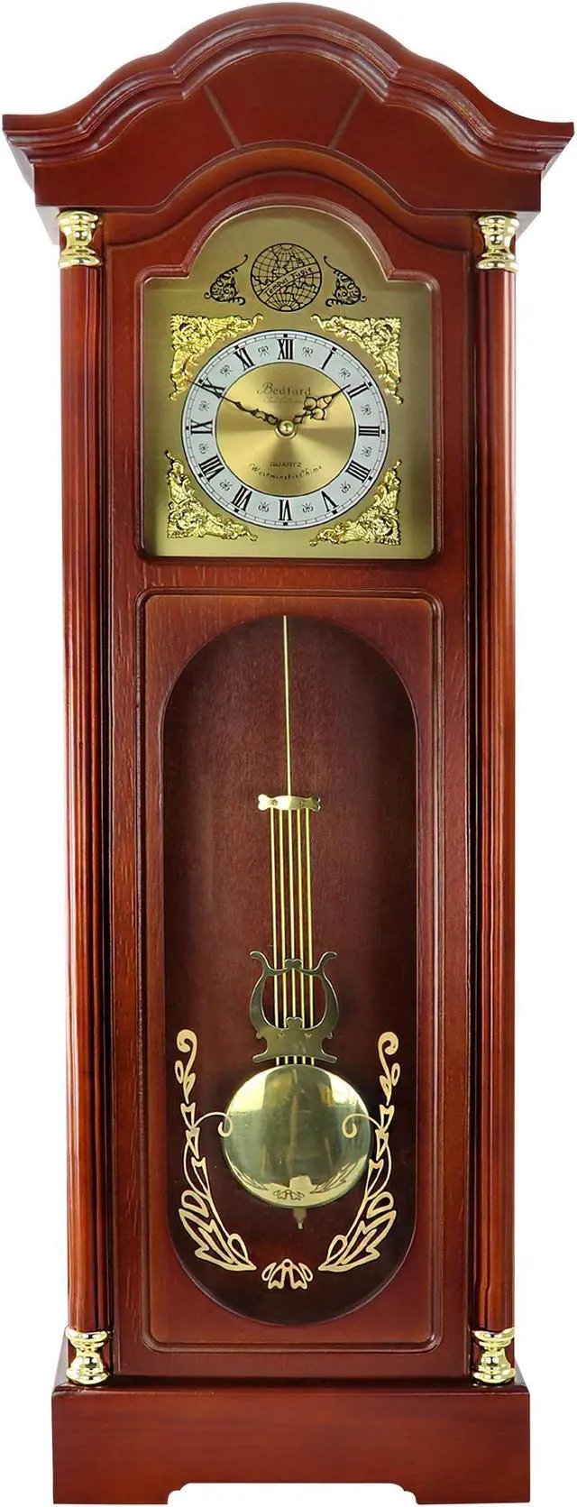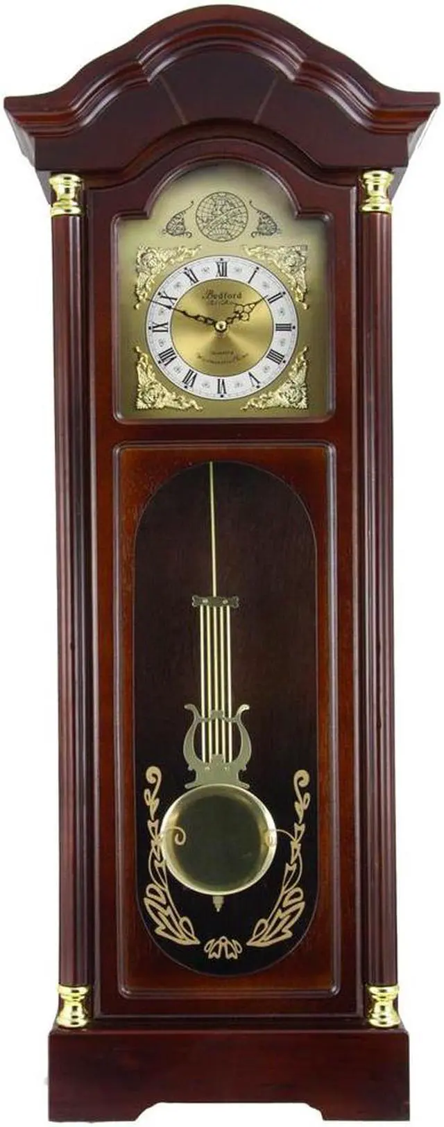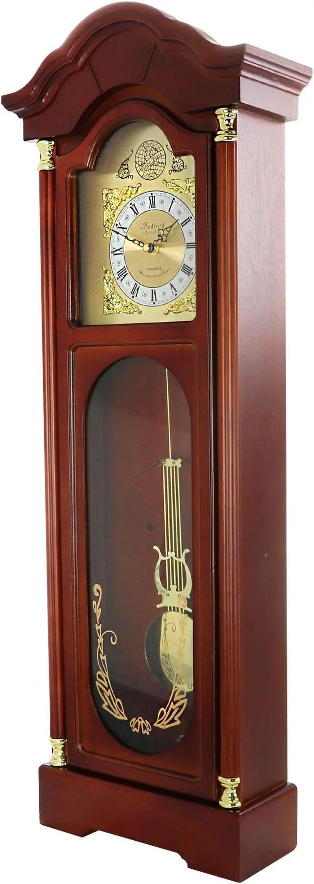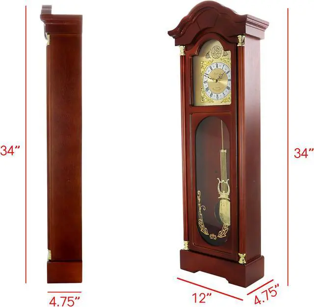 | Features | Face size: 4 1/2" Dia Type of movement/Mechanism: Analog Power source: Two AA for chimes and two AA batteries for clock (not included) Face/number style: Roman numerals Size: 33"H, 16"H (pendulum) Style: Antique Chime choices: To alice, strike, westminster music and strike, westminster only Decorative carved accents, metal dial Decorative glass, harmonic chimes play on the hour Adjustable volume control, chime shut off option Easy to use night time volume shut-off function at a push of a button Weight: 17 lbs. |