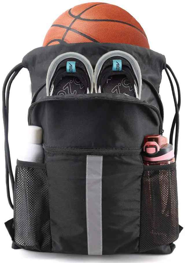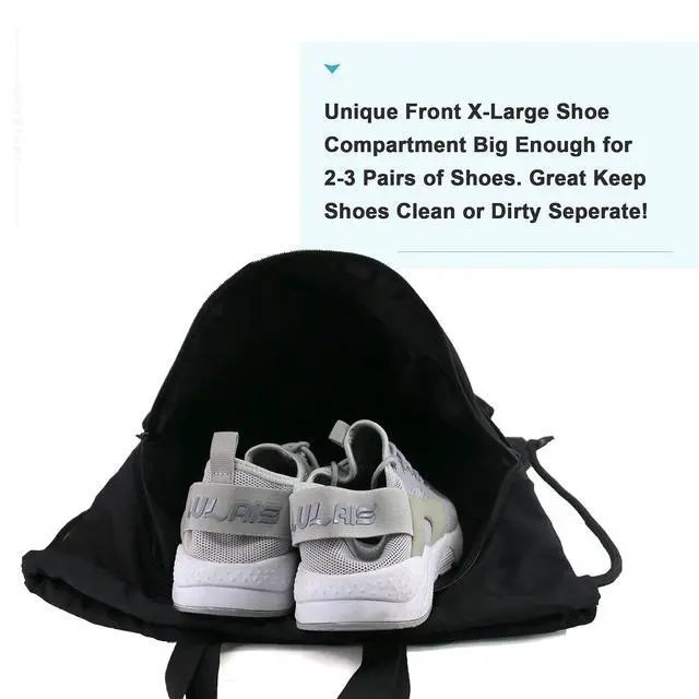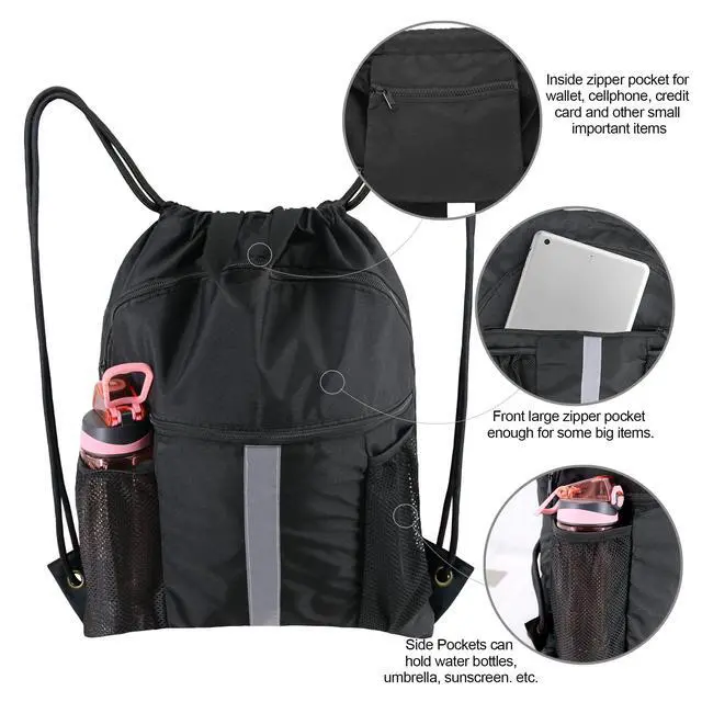 - Convenient Multi Pockets: The big shoe compartment in front of gym sack drawstring bag can hold two pairs of shoes; the smaller zipper front pocket is perfect for keeping an iPad, towel, and other items, the bigger one is an ideal place for shoes. Besides, two sides mesh bags allow you to place a water bottle, umbrella or sunglasses easily. Inside of drawstring backpack cinch pack bag, the zipper pocket can hold small valuables such as wallet, cellphone, keys and so on. Multiple Pockets help you to keep things to be placed by category, easy to be found.