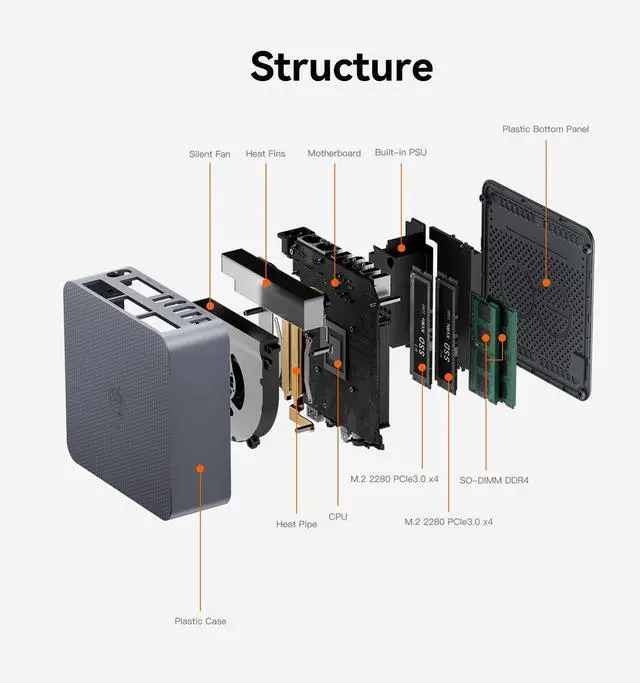 This EQR5 Mini Computer comes with the AMD 7nm Processor, 16GB DDR4 Memory(Max 2 x 16GB), and 500GB M.2 2280 NVMe SSD(Dual M.2 PCIe Gen3.0, Max 4TB*2). This High-Performance Mini PC designed by our talented European designers delivers enough power and storage for you to play, create and enjoy all day! The EQR5 Mini PC has a built-in 85W power supply, simplify your space with less cableclutter and fewer power strips