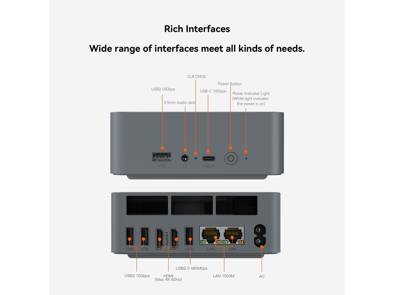 - 3*USB3.2 ports(10Gbps), 1*USB2.0 480Mbps ports, 2*HDMI port, 1*USB-C port(Data 10Gbps), and 1*3.5mm Audio,1*AC Jack.