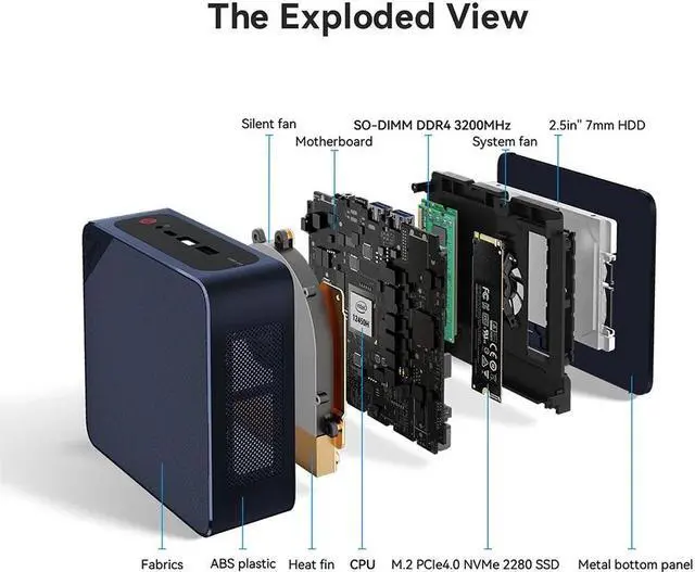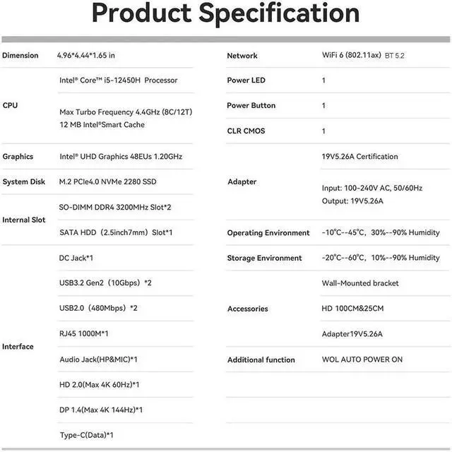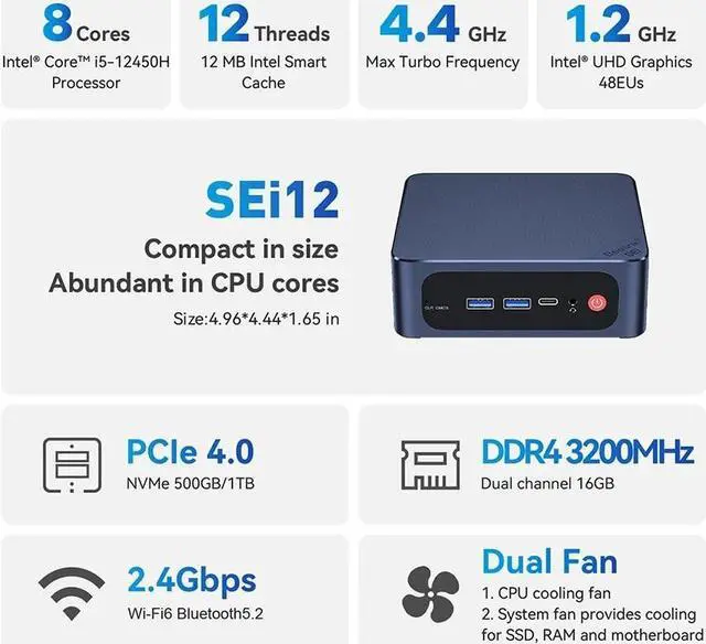 Built-in 12th Gen intel Core SEi12 12450H (8C/12T), max Turbo Frequency up to 4.4G hz supports 12MB Smart Cache, which can provide a very smooth experience for your visual home entertainment, streaming video, web browsing, work and games.
