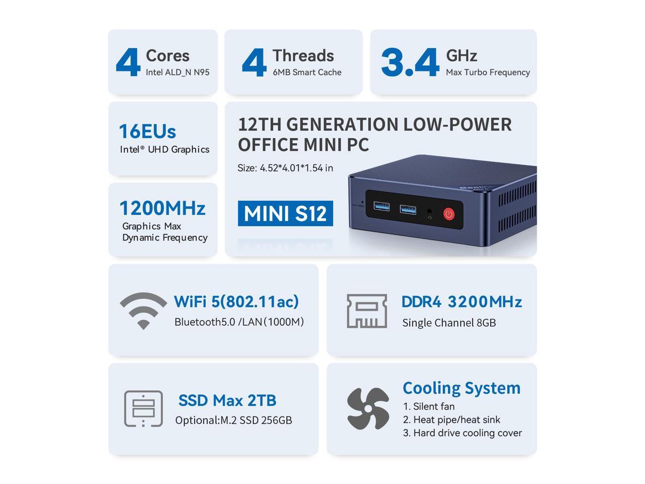 - Cost-effective - Beelink Micro PC uses N95 CPU. Its base operating frequency is up to 3.4GHz (4C/4T) and it supports a 4 MB L3 Cache.