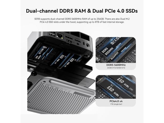 - Powerful Performance:The Beelink SER8 Mini PC is powered by the 8-core processor AMD Ryzen 7 8745HS. Its base operating frequency is up to 4.9GHz (8C/16T) and it supports a 16MB smart cache.