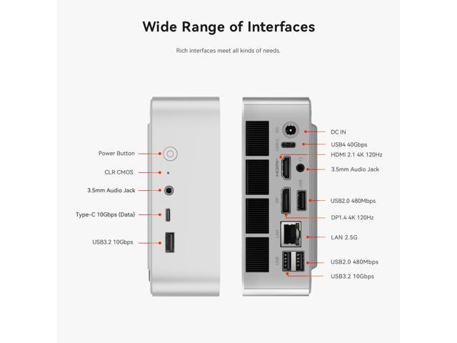 - Multiple Interfaces:The Windows Mini PC has a unique interface designed with 2 x USB 3.2 Gen2(10Gbps) port, 2 x USB 2.0 ports, 1 x USB4, 1 x Type-C, 1 x HDMI port, 1 x DP port, 1 x DC Jack port, 1 x RJ45 2.5G port, 1 x Audio Jack port.