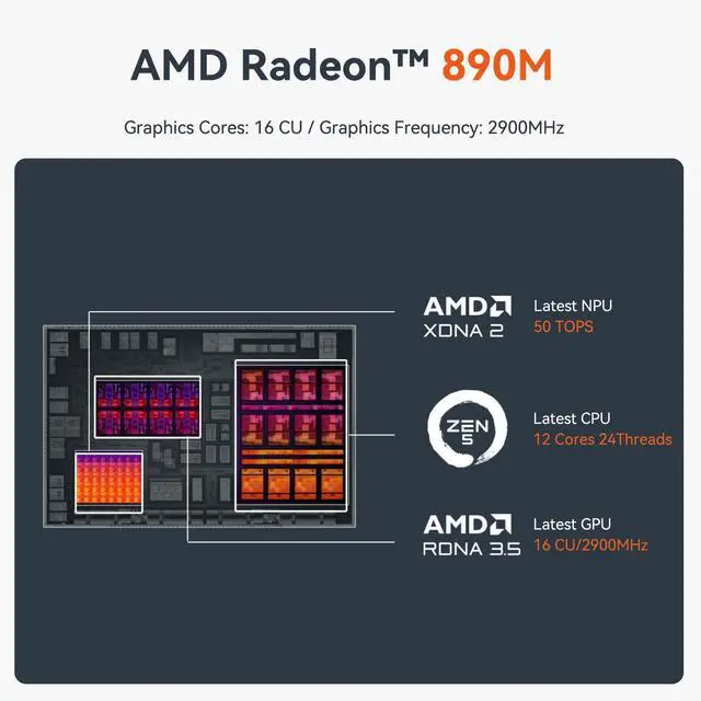 Triple Screen Display: The Gaming PC is equipped with HDMI&DP&USB4, it can connect three monitors at the same time, which improves work efficiency effectively. The beelink mini pc uses AMD Radeon 890M 16core 2900 MHz to support 4K 240Hz HD video playback, 3D rendering, and modeling, presenting ultra-sharp visuals. In addition, it can provide with smooth performance for running