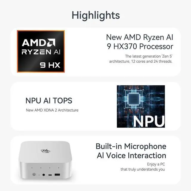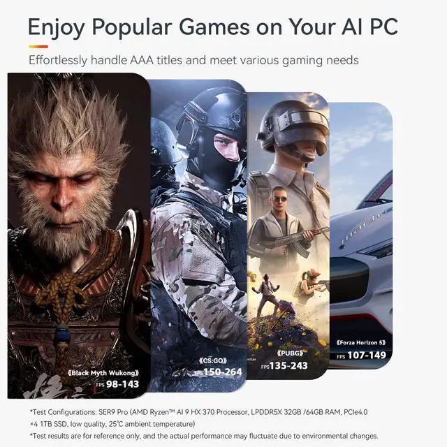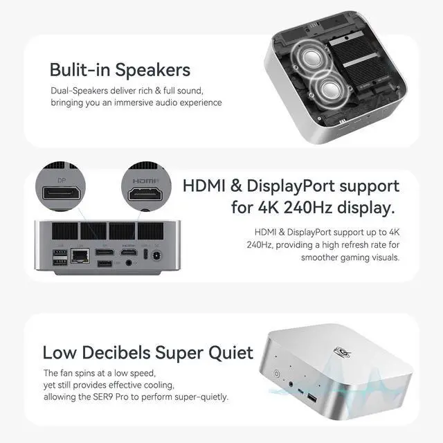 High-capacity Storage: Featuring 32GB (8GBx4) of high-frequency LPDDR5X DRAM, the SER9 Pro delivers ultra-smooth software startup and operation. The Mini PC built-in 1TB M.2 2280 NVMe PCIe4.0x4 SSD. Dual SSD slots support up to 8TB of combined storage, offering ultra-fast data transfer and ample capacity for demanding workloads, more storage space will make Mini PC run more smoothly
