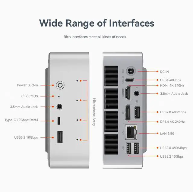 Multiple Interfaces: The Beelink Mini PC has a unique interface designed with 2 x USB 3.2 Gen2(10Gbps) port, 2 x USB 2.0 ports, 1 xUSB4(40Gbps/PD/DP1.4), 1 x Type-C 10Gbps(Data), 1 x HDMI port, 1 x DP port, 1 x DC Jack port, 1 x RJ45 2.5G port, 2 x Audio Jack (HP&MIC) port. And this mini PC wears a power LED, power button, reset button. To meet your various needs..