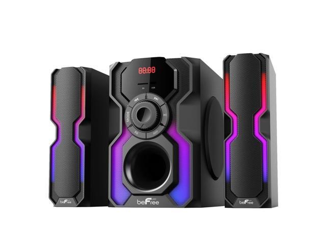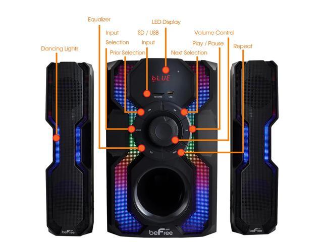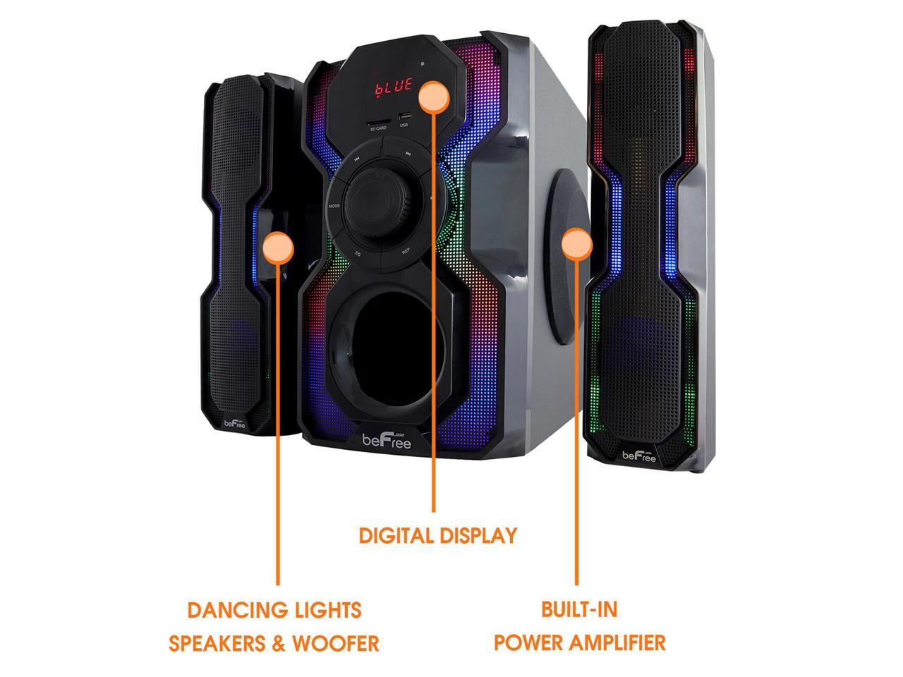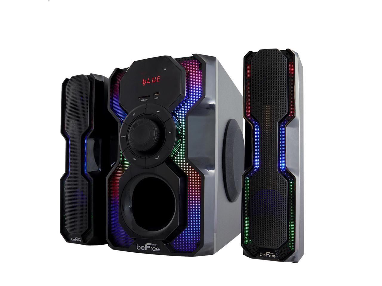 - The Hot New beFree Sound 2.1 Channel Multimedia Wired Speaker Shelf System with Sound Reactive LED lights and USB Input offer you and your home an elevated audio experience. With strong, clear and vibrant sound quality this wired shelf system will bring a smile to your face while filling your home or office with the sounds of your favorite tracks.
