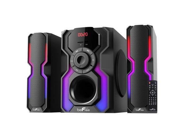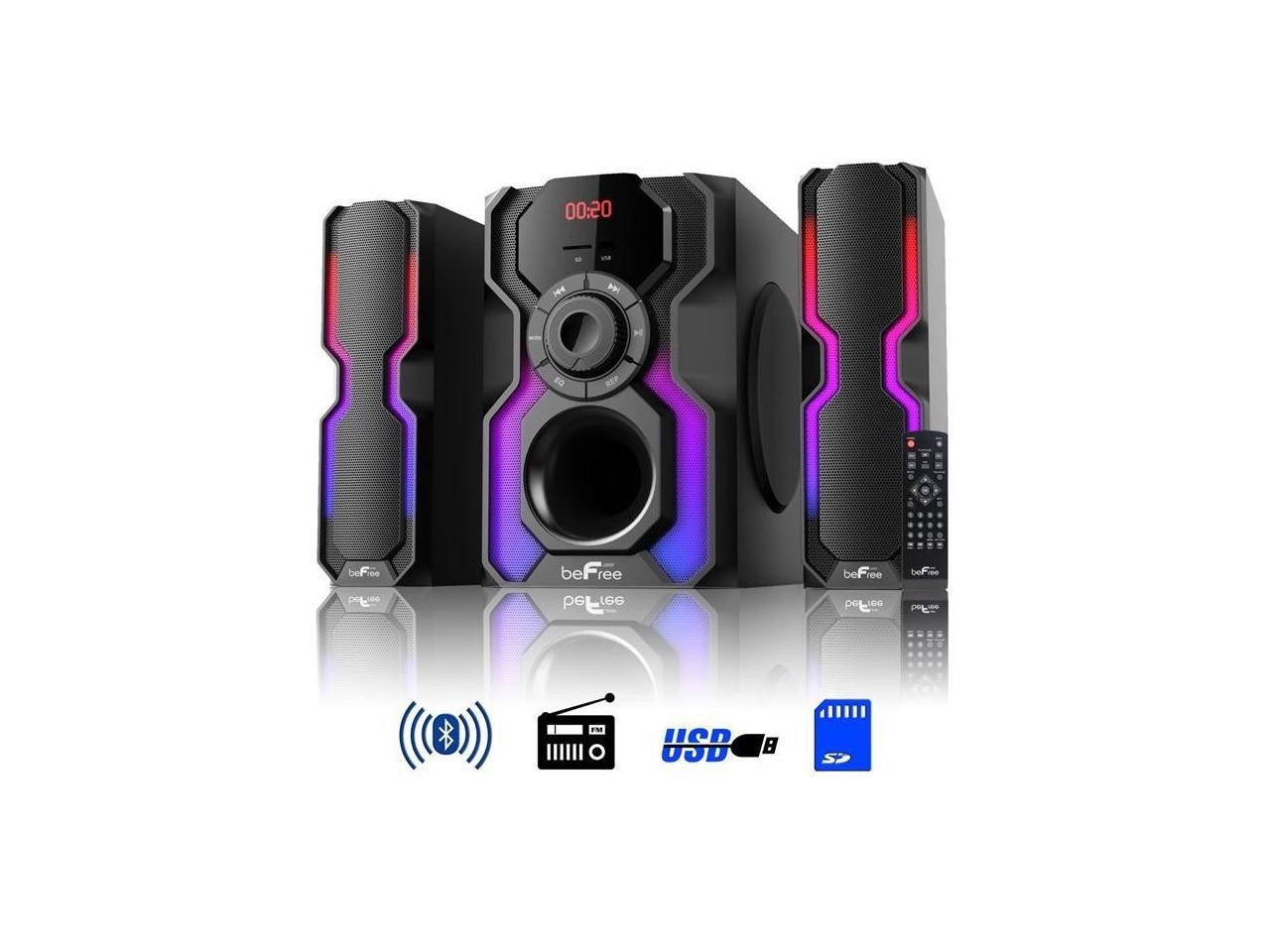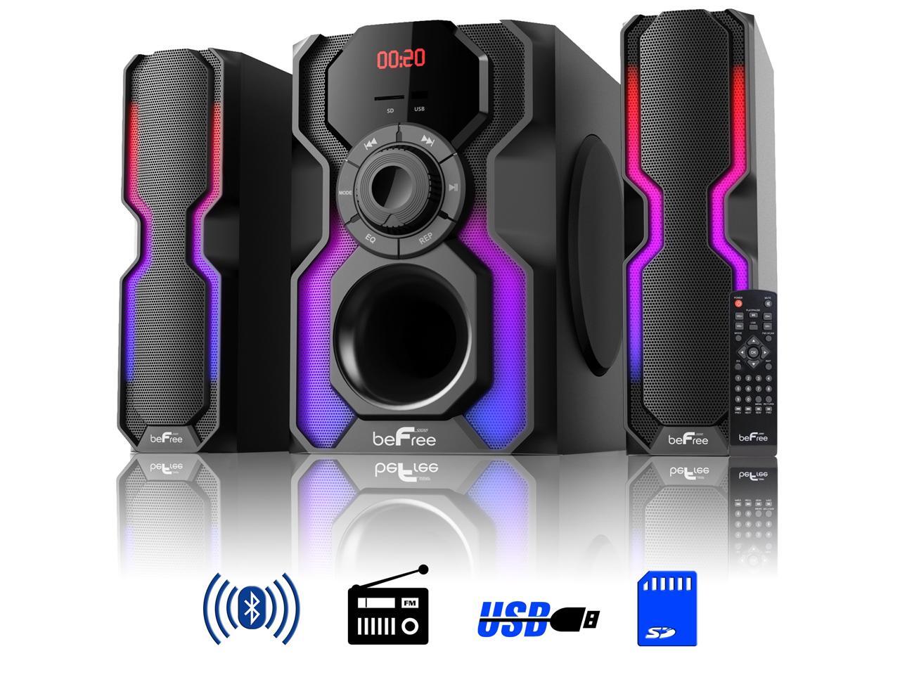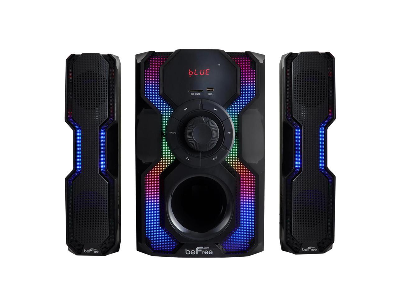 - The Hot New beFree Sound 2.1 Channel Multimedia Wired Speaker Shelf System with Sound Reactive LED lights and USB Input offer you and your home an elevated audio experience. With strong, clear and vibrant sound quality this wired shelf system will bring a smile to your face while filling your home or office with the sounds of your favorite tracks.