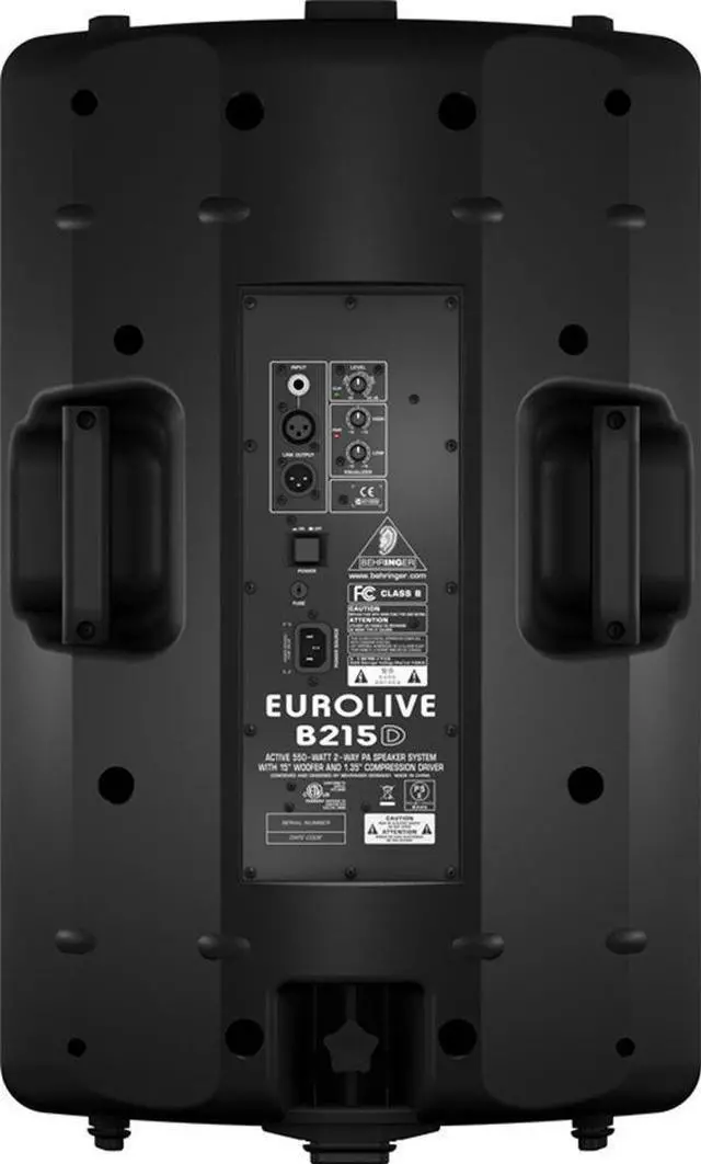 Behringer B215DThanks to our revolutionary Class-D amplifier technology and internal switch-mode power supplies, EUROLIVE D Series loudspeakers provide a much better power-to-weight ratio than competing active speakers. Put simply, you get all the power without the back-breaking weight. And the sound quality of these lightweight loudspeakers exceeds that of our extremely popular EUROLIVE B212A and B215A systems — plus we've included two 220-Watt models, the B210D (10") and B208D (8") for less demanding applications.Due to their high-efficiency design, they crank out 550/220 of the cleanest, punchiest audio Watts you've ever heard from a compact loudspeaker system. The integrated sound processor provides total system control, along with dependable protection of the LF and HF transducers, thanks to the built-in active high-pass filter, which virtually eliminate distortion — even at extreme operating levels. In addition, all four models feature an Ultra-Low Noise (ULN) Mic/Line input with LEVEL control and a dedicated 2-band EQ (bass/treble) for easy control.Intelligent by designOne of the coolest things about active loudspeakers is the lack of back-breaking racks of amps, crossovers and EQs that are often required to make passive speaker systems sound almost as good. But that comes with a trade-off — that extra weight is transferred to the loudspeaker, making it difficult for a single user to heave all that mass onto the top of a speaker stand.BEHRINGER's D Series' "Intelligent-Design" merges the best features of active loudspeakers with significantly lower weight by using switch-mode power supplies and Class-D amplifi er topology.Hidden deep inside each enclosure is the equivalent of an active 2-way electronic crossover, graphic EQ, parametric EQ, mic preamp, limiter and two Class-D power amplifiers, yet overall weight is less than comparable loudspeaker systems! These components work together seamlessly to provide optimum sound quality — and it all takes place automatically, without you having to touch a single knob.Featuers: High-power 550-Watt 2-way PA sound reinforcement speaker system for live and playback applications Ultra-compact and light weight system delivers excellent sound even at extreme sound pressure levels Revolutionary Class-D amplifier technology: enormous power, incredible sonic performance and super-light weight Internal switch-mode power supply for noise-free audio, superior transient response and very low power consumption Integrated sound processor for ultimate system control and speaker protection Extremely powerful 15'' long-excursion driver provides incredibly deep bass and acoustic power State-of-the-art 1.35'' aluminum-diaphragm compression driver for exceptional high-frequency reproduction Ultra-wide dispersion, large-format exponential horn Ultra-low noise Mic/Line input with Volume control and Clip LED Dedicated 2-band EQ for perfect sound adjustment Additional Line output allows linking of additional speaker systems Versatile trapezoidal enclosure design allows different positioning: - Stand mounting with 35-mm pole socket - Tilts on its side for use as a floor monitor Ergonomically shaped handles for easy carrying and setup High-quality components and exceptionally rugged construction ensure long life Conceived and designed by BEHRINGER Germany