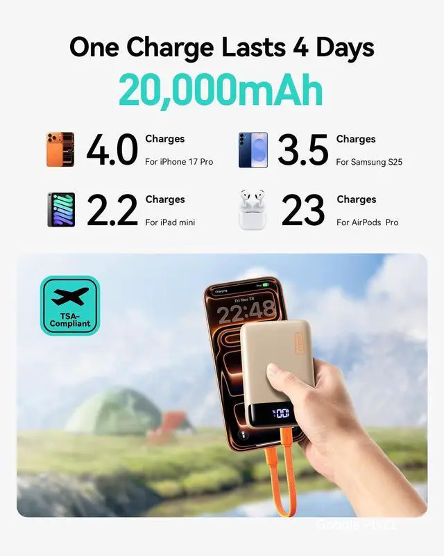 eg. (20,000mAh Powerbank × 0.65) ÷ 3279mAh iPhone14 battery ˜ 4.0 charges"