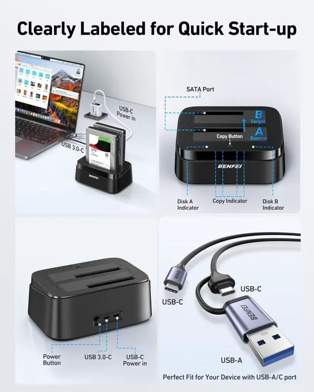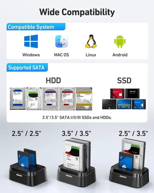 Effortless Dual-Bay Operation & Data Management Work on two drives at once! Read, write, and transfer data between two 2.5 or 3.5 HDD/SSD simultaneously. Perfect for quickly backing up important files, migrating your entire system to a new drive, or simply expanding your storage capacity without the need for multiple docks.