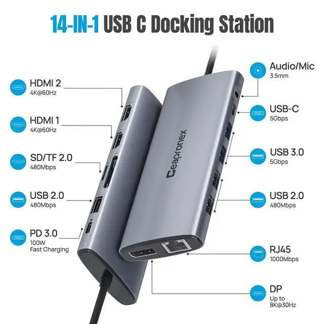 14 in 1 USB C Hub USB C Docking Station for LaptopTransform your laptop with this usb c displaylink docking station dual monitor featuring dual Monitor 4K HDMI, DP Display port (8K@30Hz), Gigabit Ethernet port, 2 USB 3.0 ports, 3 USB 2.0 ports, USB C Power Charging Port (max 100W), USB C Data Transfer port(5Gbps), SD/TF card readers and 3.5mm Mic/audio. Suitable for home and office use for effective work
