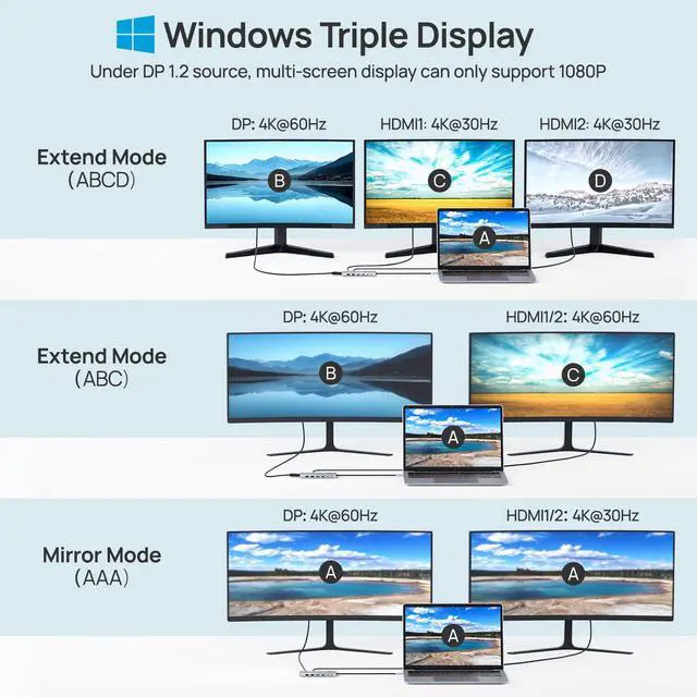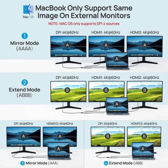 Triple Display Docking Station Dual/3 MonitorsThis laptop docking stations dual monitor with three high-definition video output ports: HDMI+HDMI+DP. While single use displayport resolution up to 8K@30Hz, single use HDMI resolution up to 4K@60Hz. Dual monitors will be 4K@60Hz or 4K@30Hz(DP1.4). Triple monitors will be 4K@60Hz or 4K@30H(DP1.4). Note: macOS does not support MST, three extended monitor shows the same screen