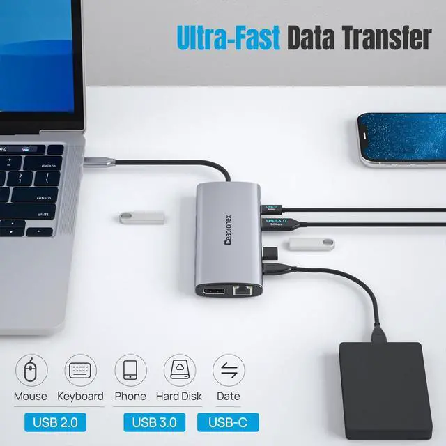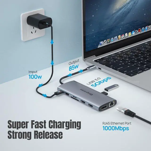 Fast Data Transmission & Gigabit EtherneThe laptop hub built in 2 USB3.0 + 1 USB-C3.0 + 3 USB2.0 Ports, which fulfill the 5Gb/s high speed rates data transfer and wide range of applications at the same time. 1000Mbps Gigabit RJ45 Ethernet download movies quickly and reduce game lag. Convenient USB C to SD/TF card reader(speed up to 480Mbs) that allows you to quickly view your photos or videos