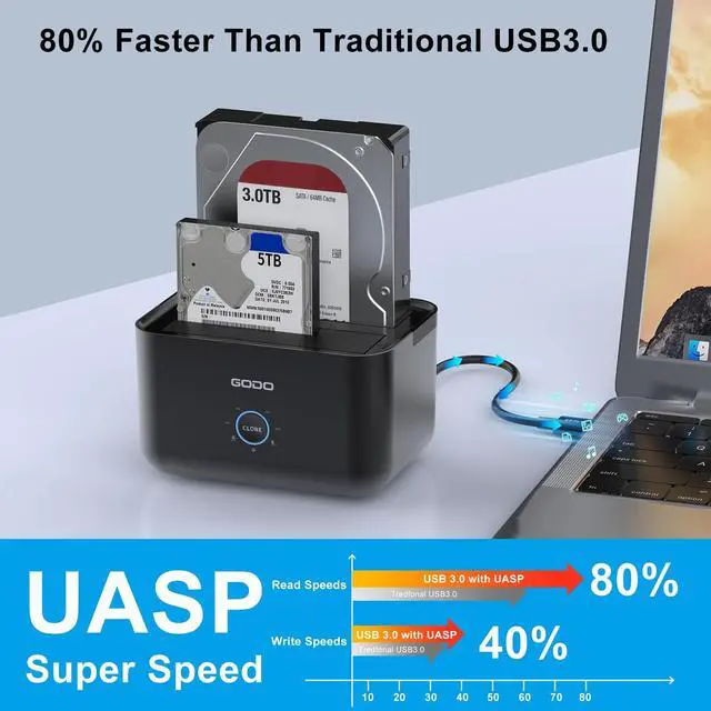 6Gbps Super-speed TransmissionGODO SATA HDD SSD Docking Station Support USB 3.0 (6Gbps) with UASP acceleration protocol, effectively improve transmission performance. 80% Faster read speeds and 40% faster write speeds than conventional USB 3.0 when the dual bay hard drive docking station connected to a computer that also supports UASP. this hard drive enclosure backwards compatible with USB 2.0 or 1.1 ports