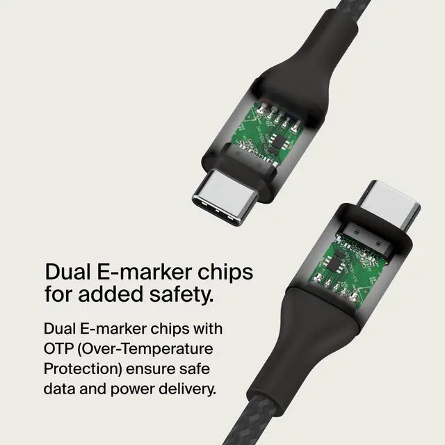 SAFE CHARGE plus 2-YEAR COVERAGE: Designed with dual E-marker chips with OTP (Over-Temperature Protection) to ensure charging safety. And it comes with 2-year coverage, so you can rest assured that your charging cable and more are covered from damage.