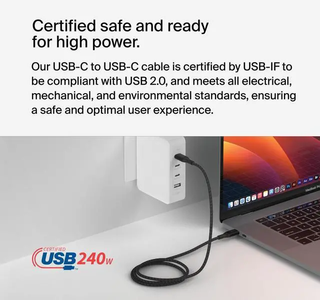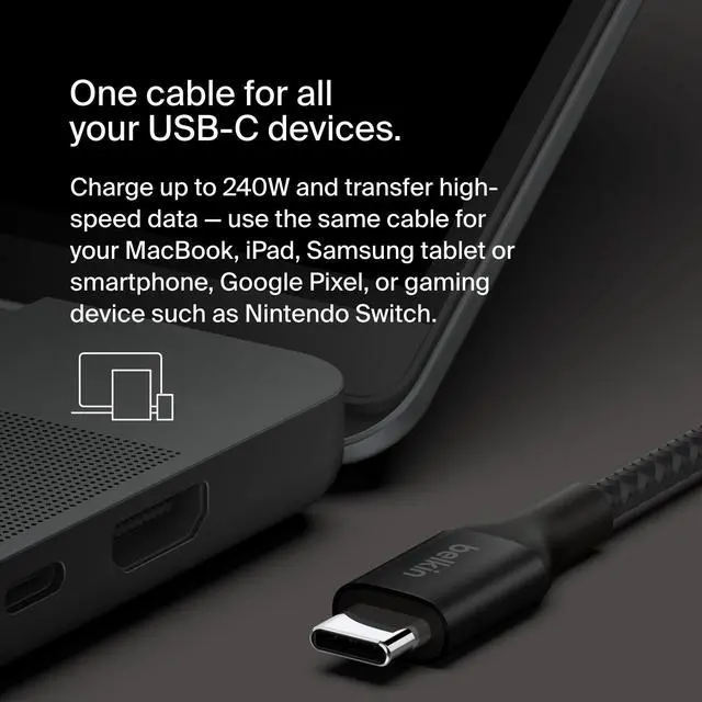 OPTIMAL CHARGING SPEEDS: Our BoostCharge charging cable supports fast charging up to 240W for laptops, tablets, and smartphones. Fast charge a MacBook Pro 14" from 0-50% in just 31 minutes, as well as iPad Air 5, Samsung S23, Nintendo Switch 2 and more at optimal speeds