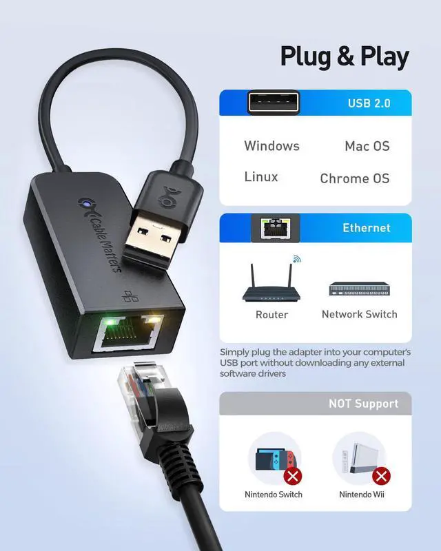 The Cable Matters USB to Fast Ethernet Adapter brings Fast Ethernet connectivity to your Ultrabook, notebook, or tablet with a network connection up to 100 Mbps. This compact and lightweight USB to network adapter is a perfect accessory for file transferring with Fast Ethernet, which is more reliable than a wireless network.