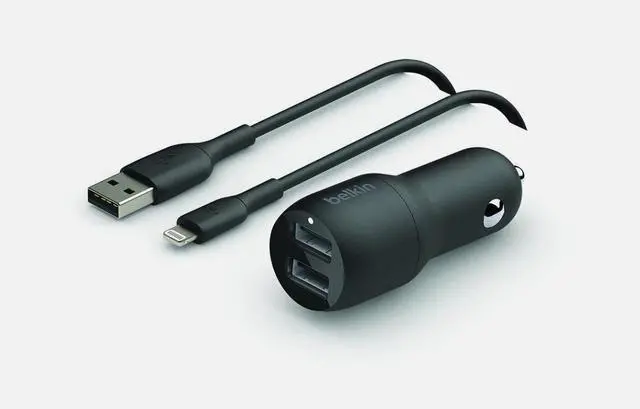 Dual ports charge two devices at once from a single car power socket 12W power from each port for 24W of total output power Compatible with any device that uses a USB-A cable 1m/3.3ft USB-A to Lightning cable included