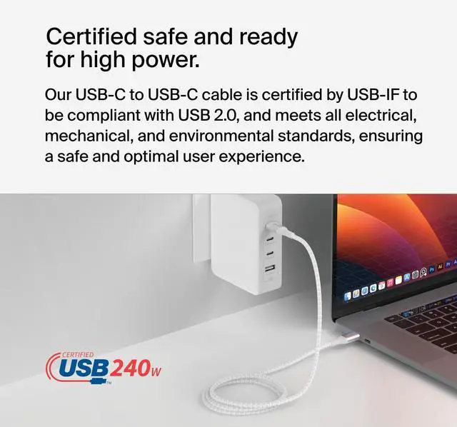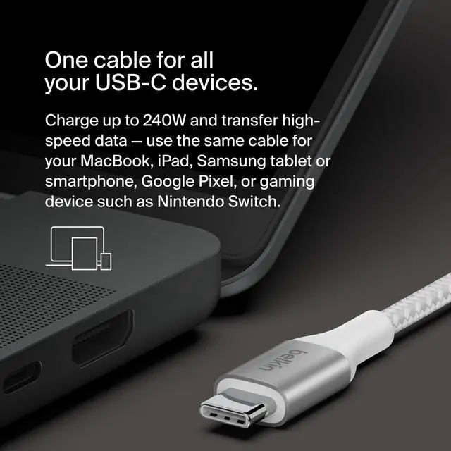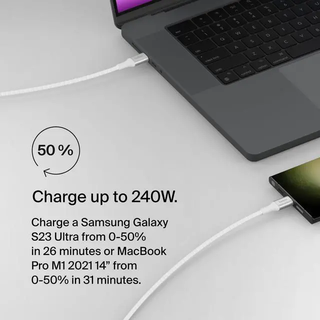 OPTIMAL CHARGING SPEEDS: Our BoostCharge charging cable supports fast charging up to 240W for laptops, tablets, and smartphones. Fast charge a MacBook Pro 14" from 0-50% in just 31 minutes, as well as iPad Air 5, Samsung S23, Nintendo Switch 2 and more at optimal speeds.