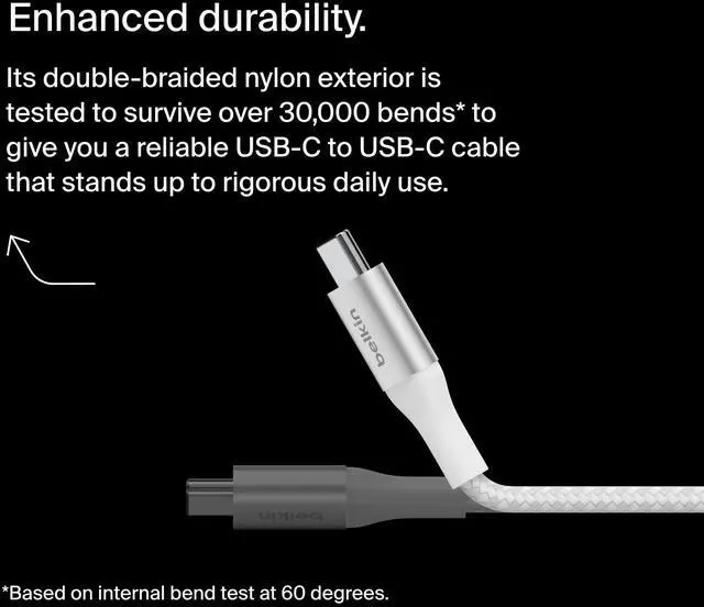 MADE TO LAST: This USB-C to USB-C cord is designed for lasting use, with a durable anodized aluminum cable head and double-braided nylon cable design that's been tested to survive over 30,000 bends and 10,000 plug-ins.