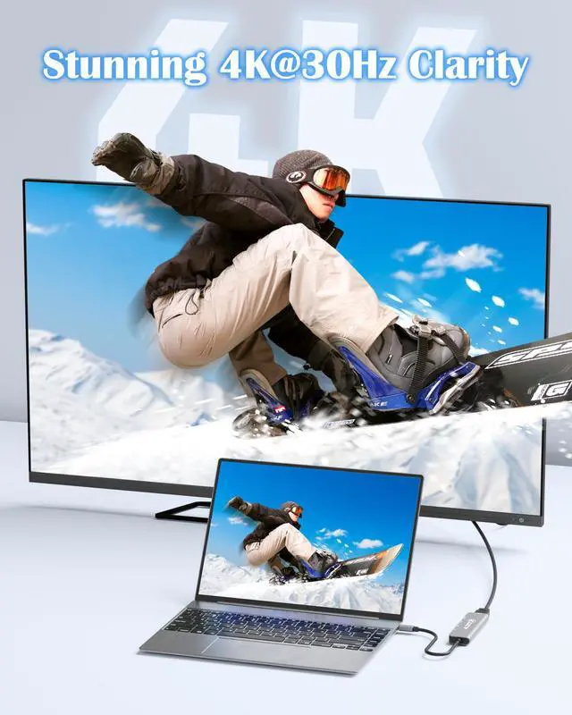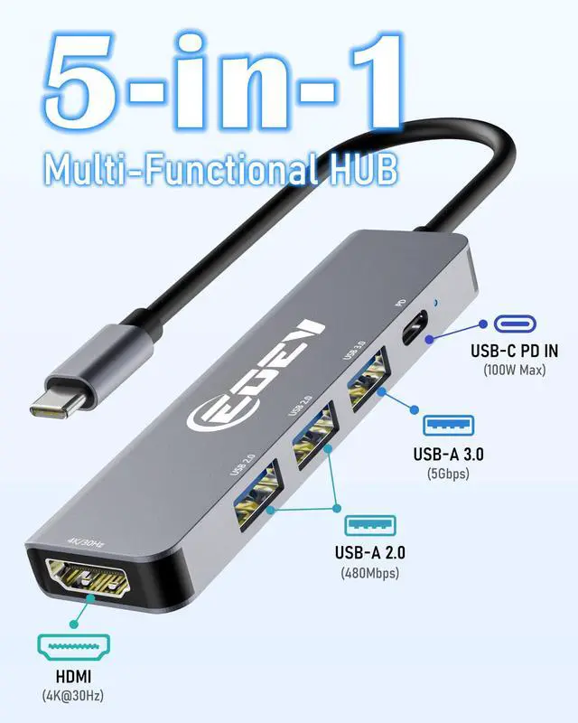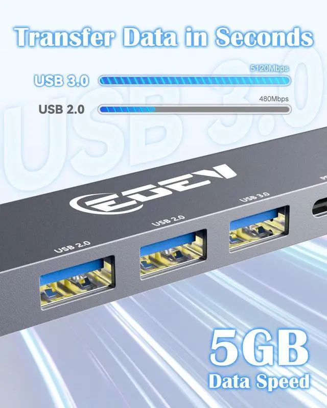 The hdmi hub includes 1 4K HDMI, 1 USB-A 3.0 port (up to 5Gbps) for fast data transfer and 2 USB-A 2.0 ports for keyboards, mice, or other peripherals.