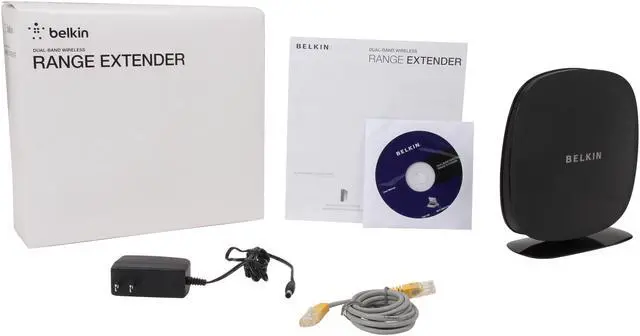 Belkin Dual-Band Wireless Range Extender, Power supply, Networking cable, CD user manual, and Quick-installation guide.