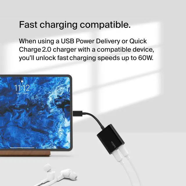 USB-C Audio + Charge Adapter, Headphone Adapter w/ USB-C 60W Power Delivery Fast Charging for iPhone, iPad Pro, Galaxy, Note, Google Pixel, LG G6, Sony Xperia, OnePlus, & More - Black