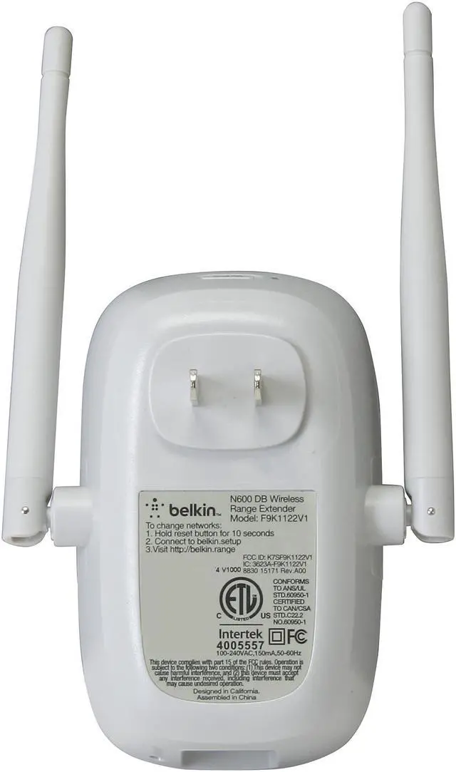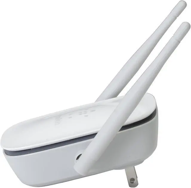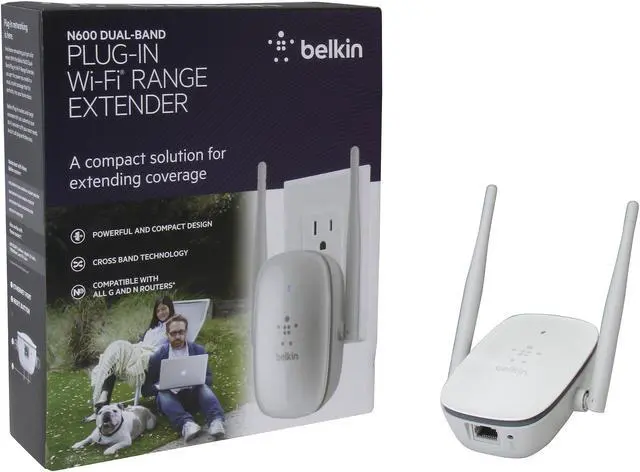 The Belkin N600 Dual-Band Wi-Fi® Range Extender expands your wireless network, while its compact, elegant design complements your home décor. With high performance speeds of up to 300Mbps (2.4GHz) + 300Mbps (5GHz)* and external antennas for superior range, you'll have strong, reliable Wi-Fi throughout your home. Simple Start makes set up quick and easy on any smartphone, tablet or laptop -just plug the Belkin N600 Dual-Band Wi-Fi Range Extender right into the wall, access Simple Start and you're ready to go in minutes. Crossband technology increase speeds vs. normal range extenders by switching to the least congested band. Compatible with G and N technology devices, the N600 Dual Band Wi-Fi Router makes home networking a lot easier by keeping all your Wi-Fi devices connected.