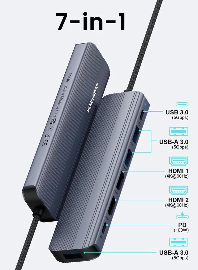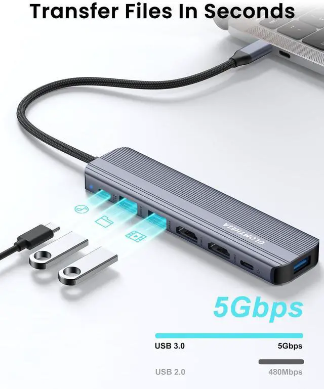 7-in-1 USB C Hub for Ultimate Productivity Expand your laptops capabilities with dual HDMI 4K@60Hz, 3xUSB 3.0 ports (5Gbps), 100W PD charging, and a 5Gbps USB-C data portall in one compact docking station.