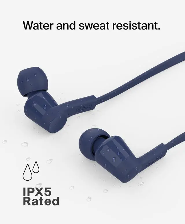 Always ready for action with a flat, tangle-free cable and no battery to charge, our USB-C Wired Earbuds deliver high-quality, immersive Belkin Signature Sound with supreme comfort and fit. Safe Sound for All keeps an 85 dB volume limit, which can be disabled to a 100 dB limit when not needed. Packed with features including water resistance and five sizes of comfortable ear tips, these durable compact earbuds offer superior audio without distraction.