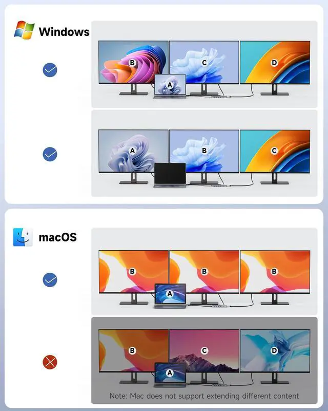 7:All Mac devices only support Mirror Mode: AA, AAA, AAAA and Extend Mode: AB, ABB, ABBB. It does not support A-B+C or A-B+C+D, which are only supported on Windows laptops.If mirroring displays on a Windows system, the monitor's resolution will always match that of the laptop.
