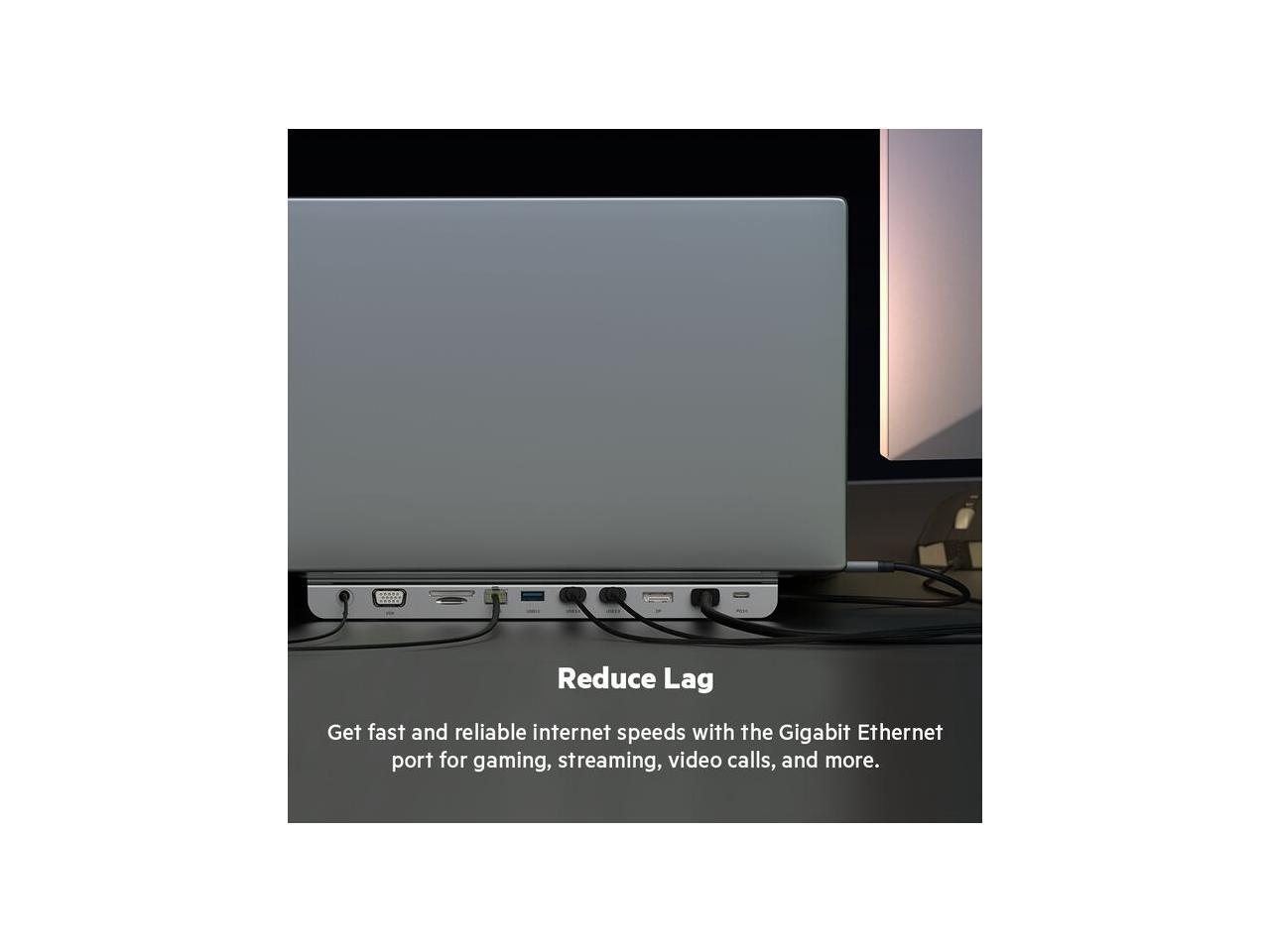 Expands USB-C port into an HDMI port, DisplayPort, VGA port, 3 USB-A ports, Gigabit Ethernet port, SD and MicroSD card readers, 3.5mm audio port, and USB-C PD port