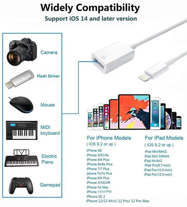 Compatible with iPad Mini, Mini 2, Mini 3, Mini 4, Air, Air 2, iPad Pro (9.7-inch), iPad Pro (12.9-inch) (USB C iPad Pro not compatible)