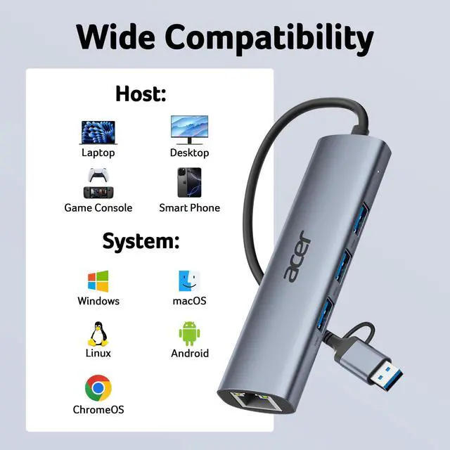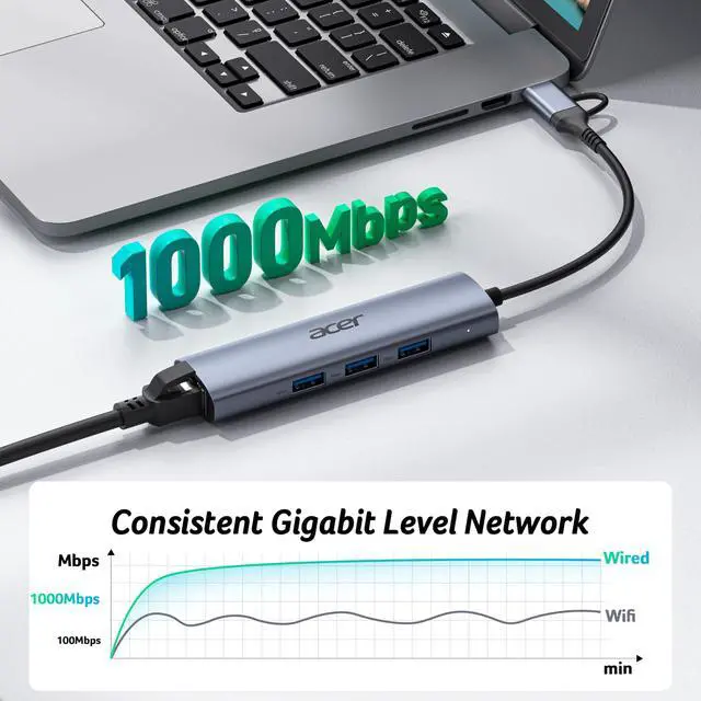 | How to reach 1 Gbps? | Please make sure: 1) Your network service and your device is compatible 1 Gbps. 2) Use CAT6 & up Ethernet cables. 3) The cable is securely plugged into the usb hub. |