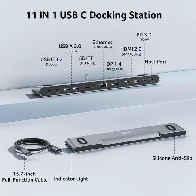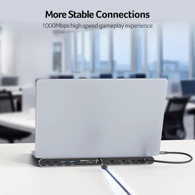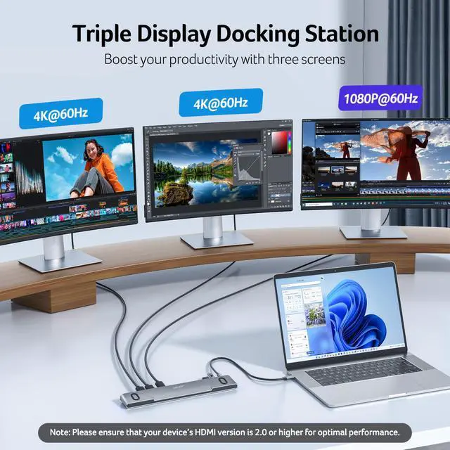 | ??Triple Display Support | This USB-C docking station supports up to 3 monitors with 2HDMI+DP, typically 4K@60Hz + 4K@60Hz + 1080P@60Hz. |